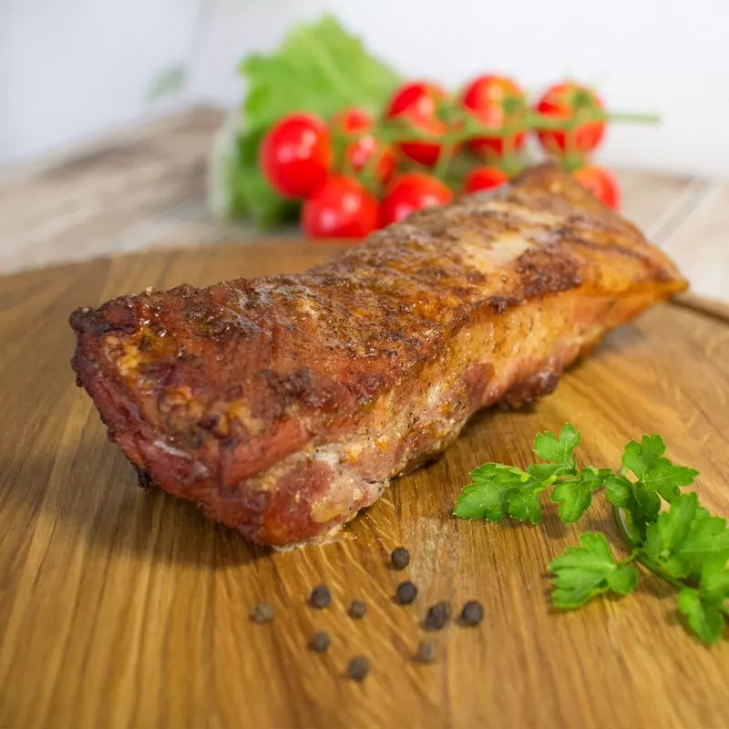 Wędzona drewnem bukowym w tradycyjnej wędzarni. Wykonana z chudego mięsa wieprzowego-biodrówki – 85% i golonki wieprzowej – 5%.