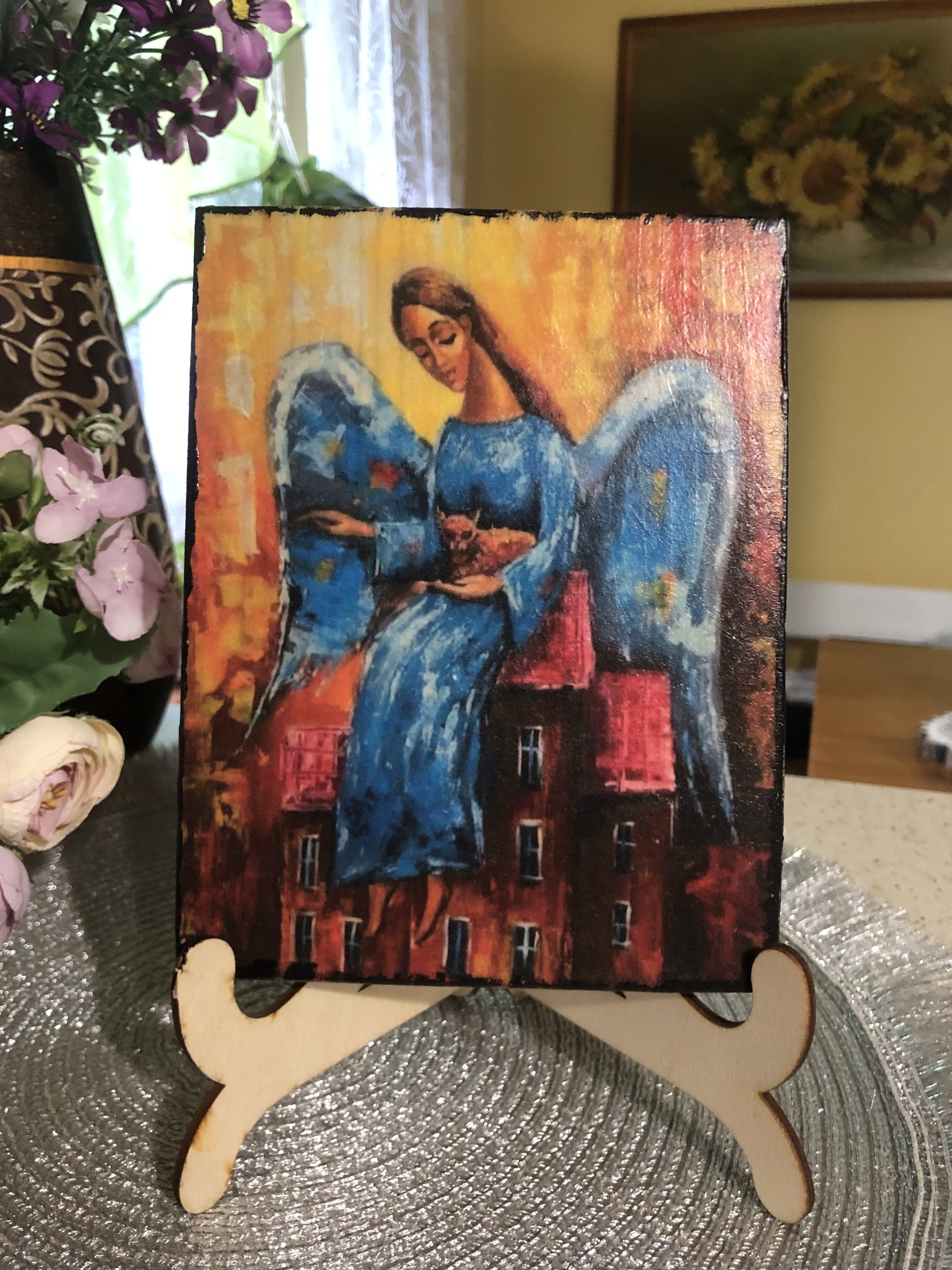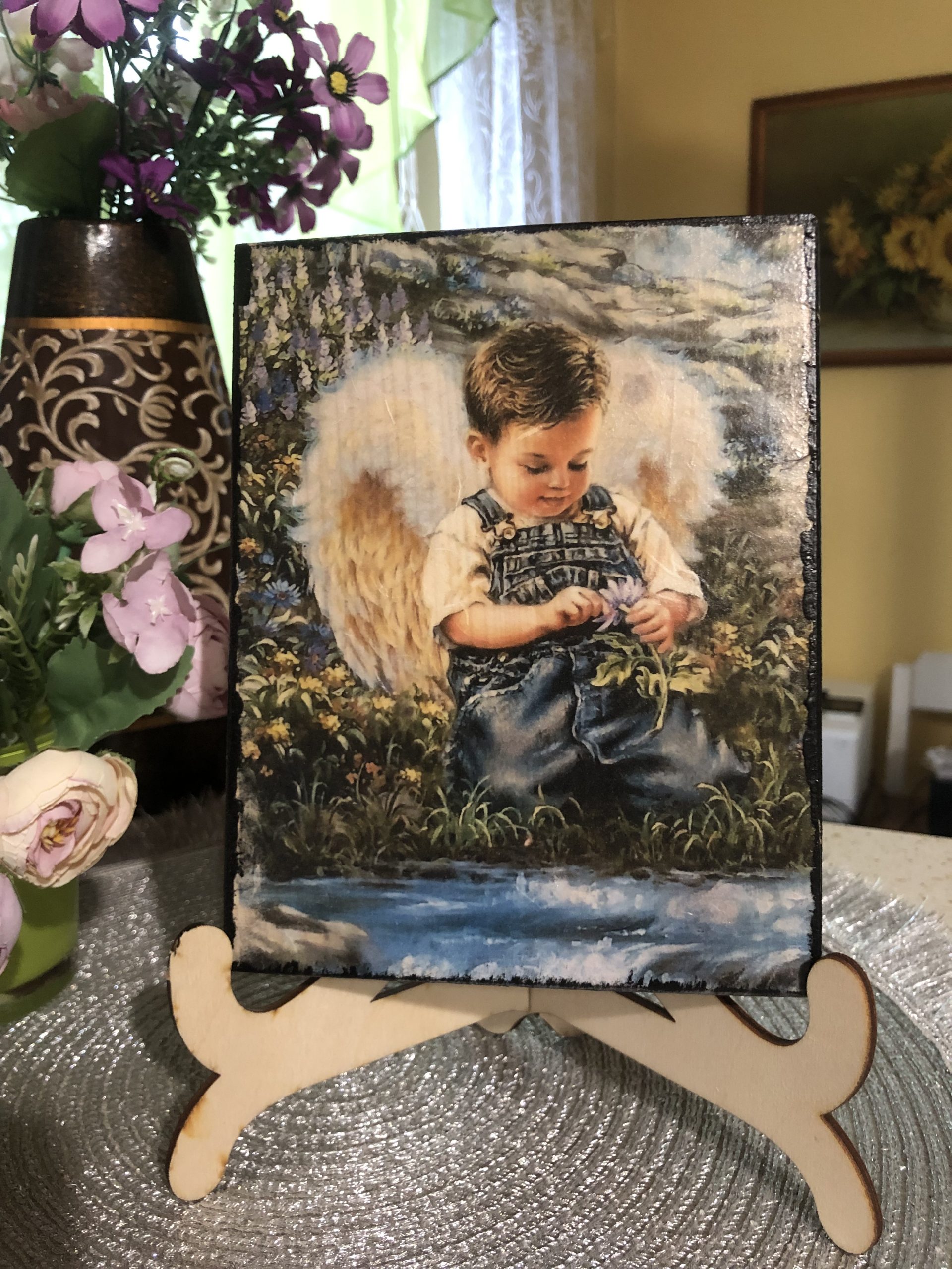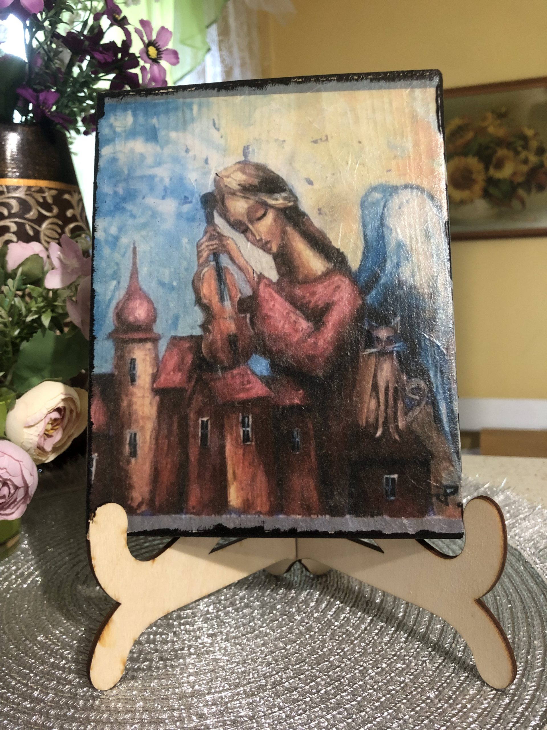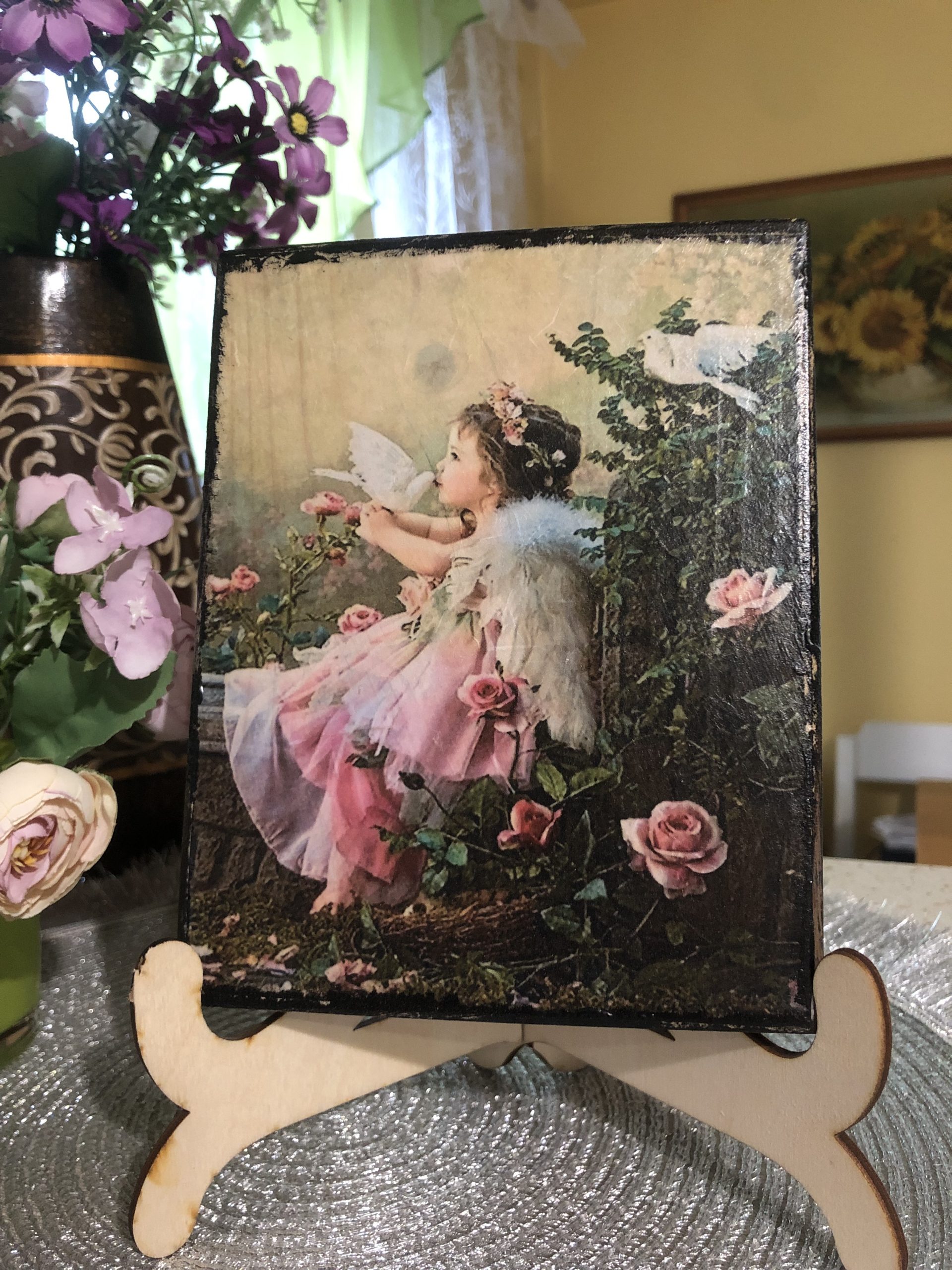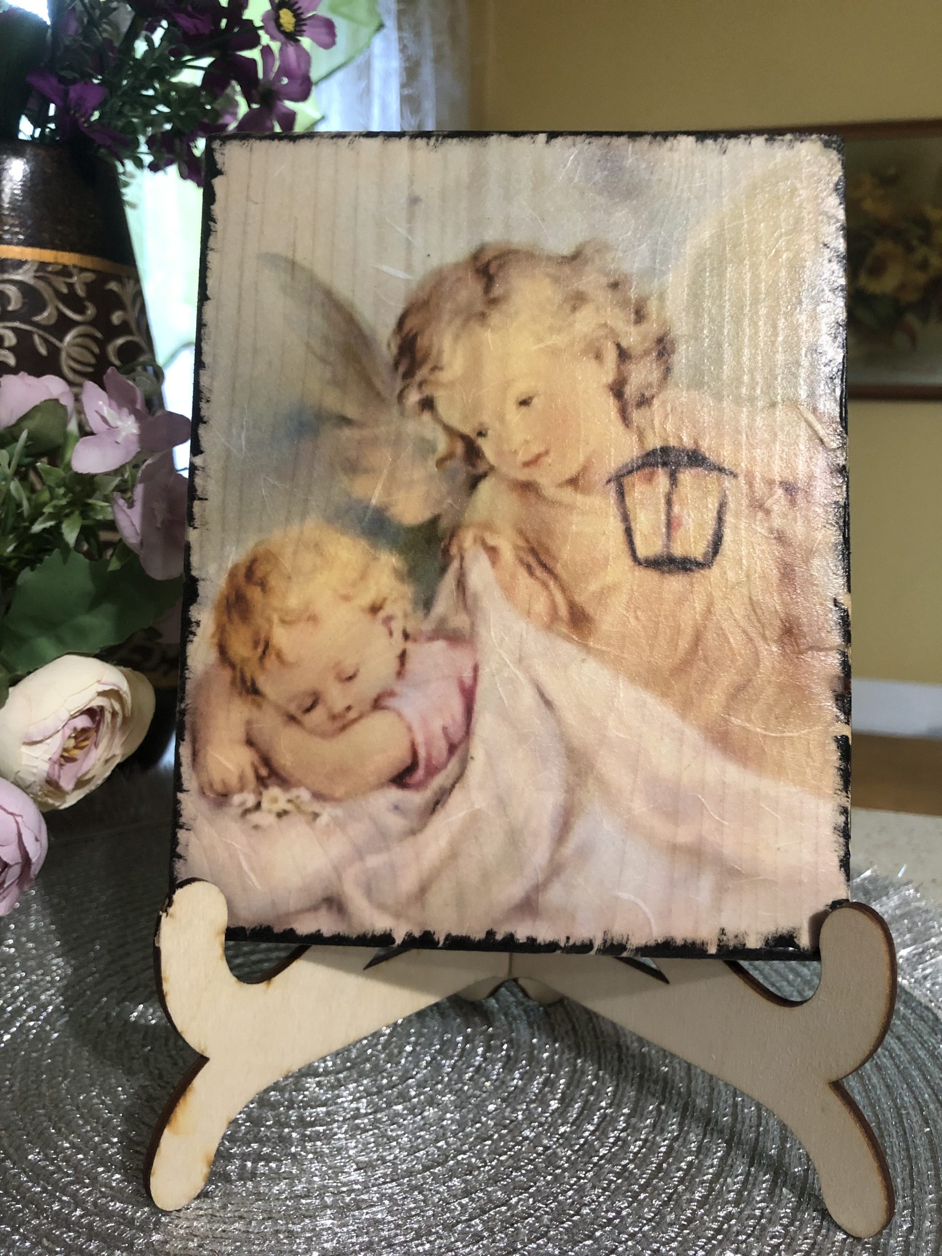 Obrazki – Aniołki na desce. Oferta z podstawką. Wykonane metodą decoupage na drewnie. Wierzch pokryty werniksem.