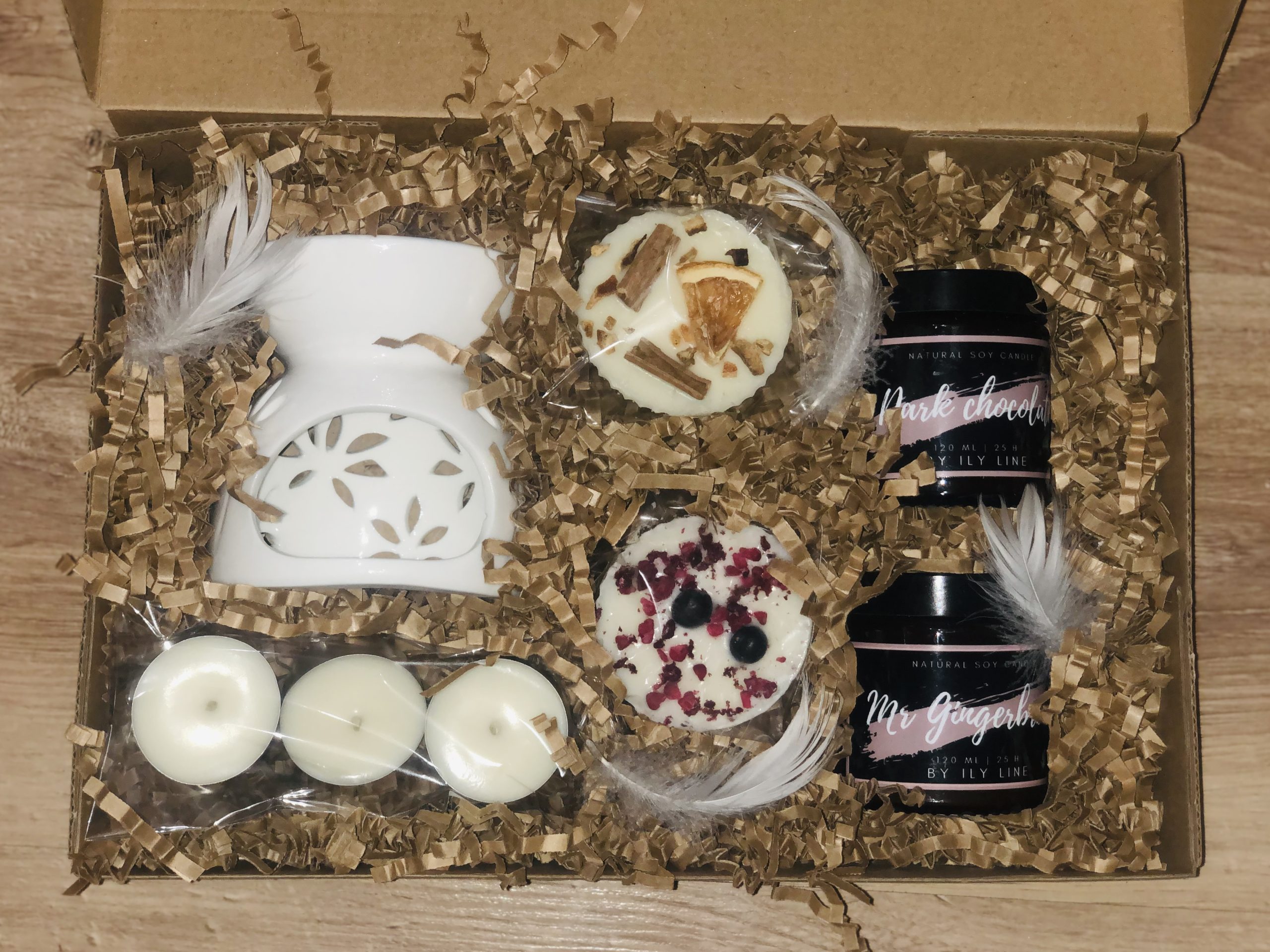 Zestaw składa się z dwóch świec o pojemności 120 ml, dwuch wosków, kominka oraz podgrzewaczy z wosku sojowego. Całość owinięta jest satynową wstążką.